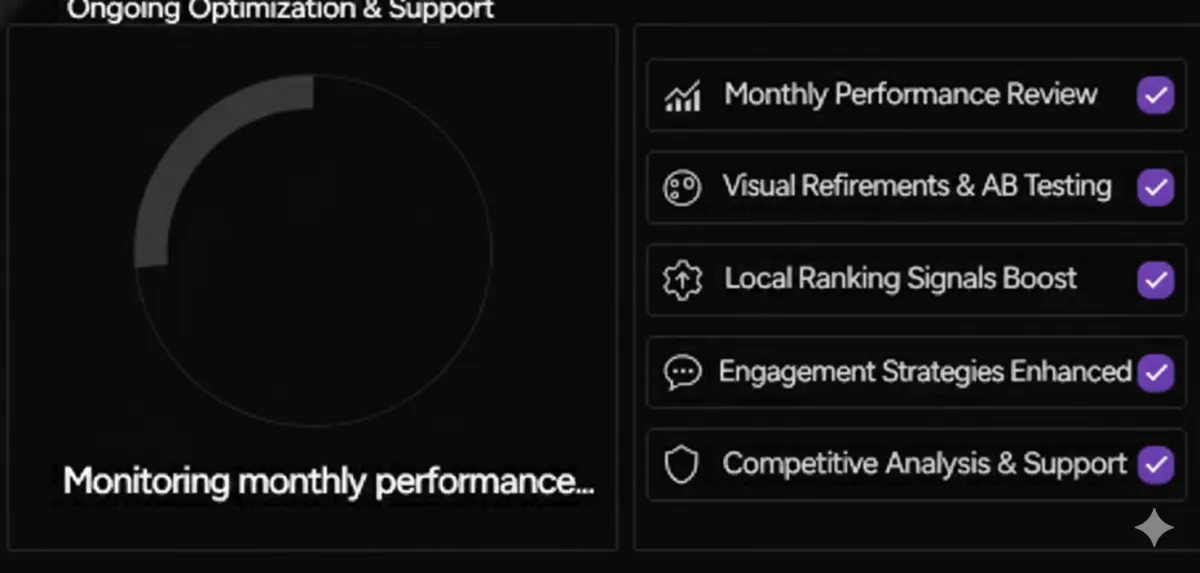 We monitor performance monthly, refine visuals, improve ranking signals, and enhance engagement — keeping your brand visible, trusted, and consistently ahead of competitors.